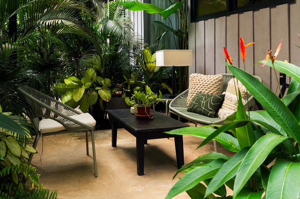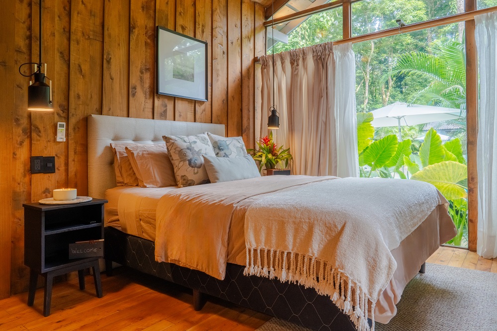Designed for two guests each, featuring Scandinavian/boho-inspired interiors with queen-size beds, full kitchenettes (microwave, induction range top, mini fridge, espresso machine), 40-inch Android TVs with streaming services, Bluetooth speakers, 100 Mbps Wi-Fi, spacious rain showers, safes, beach towels, and private terraces overlooking a central pool or lush tropical gardens.